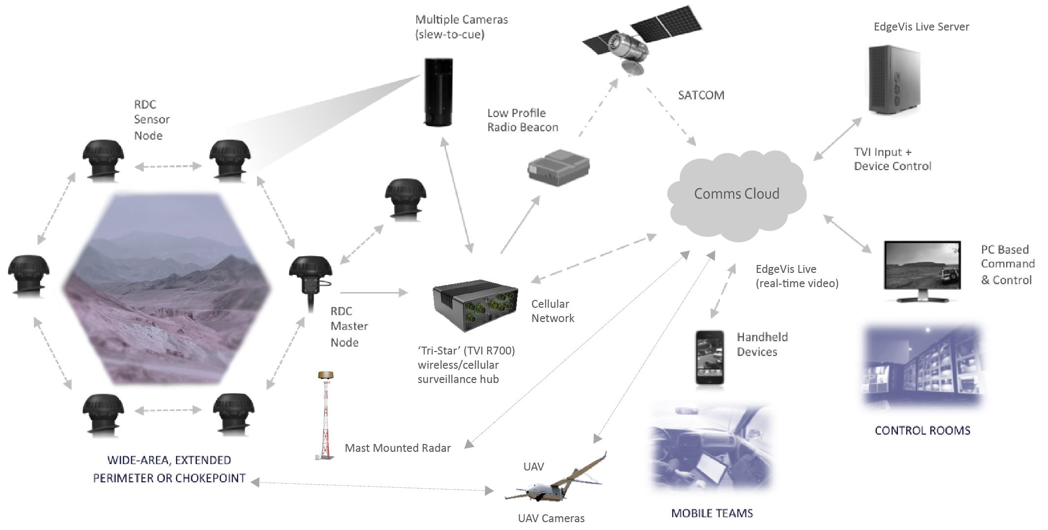ระบบเซนเซอร์ตรวจจับความเคลื่อนไหวภาคพื้นดิน (UGS) ระบบเซนเซอร์ตรวจจับความเคลื่อนไหวภาคพื้นดิน (UGS) เป็นระบบเซนเซอร์สำหรับตรวจจับความแรงสั่นสะเทือนที่เกิดจากการเคลื่อนไหวภาคพื้นดิน ทำงานโดยอัตโนมัติ มีการเชื่อมต่อผ่านเครือข่ายไร้สาย ซึ่งเหมาะสำหรับการเฝ้าระวังพื้นที่บริเวณกว้าง เช่น การป้องกันพื้นที่ตามแนวชายแดน, การปกป้องพื้นที่กองกำลังและพื้นที่สำคัญต่างๆ เป็นต้น โดย RDC Seismic Sensor Node ออกแบบเป็นสกรู ง่ายต่อการติดตั้งและซ่อนพรางได้ดี สามารถทำการตรวจสอบตำแหน่งที่ตั้งของแต่ละ RDC Seismic Sensor Node และมีชุดกล้องในการแสดงภาพหรือ ใช้งานร่วมกับระบบกล้องที่มีอยู่ โดยมีขีดความสามารถในการตรวจจับแรงสั่นสะเทือนที่เกิดจากความเคลื่อนไหวบนพื้นที่ติดตั้ง เมื่อมีบุคคลหรือพาหนะ เข้ามาในบริเวณพื้นที่จะทำการแจ้งเตือน และทำการหมุนกล้องและซูมเพื่อทำการแสดงภาพตรงจุดที่มีการแจ้งเตือนเกิดขึ้นอย่างรวดเร็ว นำมาแสดงที่หน้าต่างของโปรแกรมควบคุมบนเครื่องคอมพิวเตอร์ หรือ สมาร์ทโฟนได้
